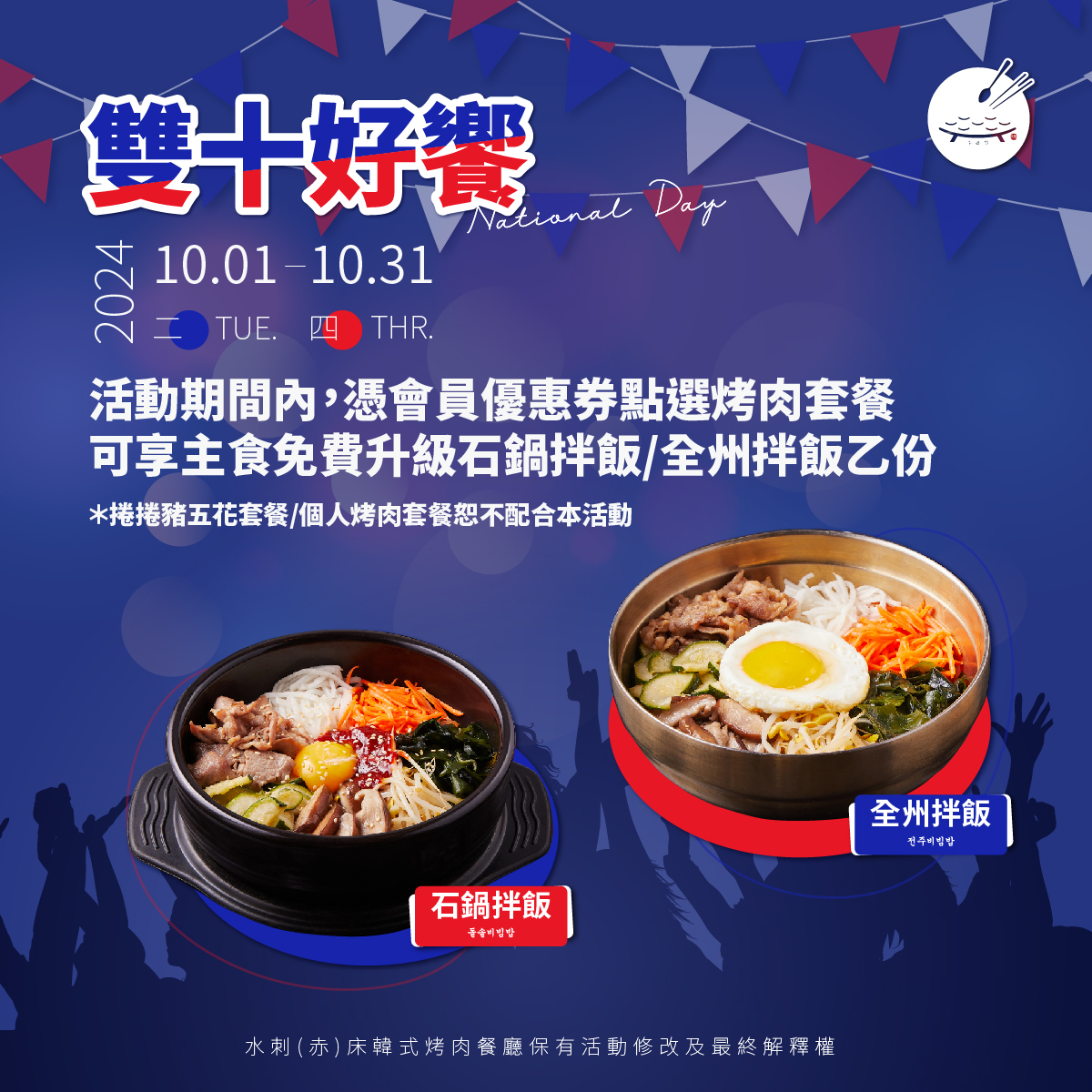 > 會員憑券來店 點選雙人/四人烤肉套餐可享主食免費升級石鍋拌飯/全州拌飯(牛肉/豬肉)