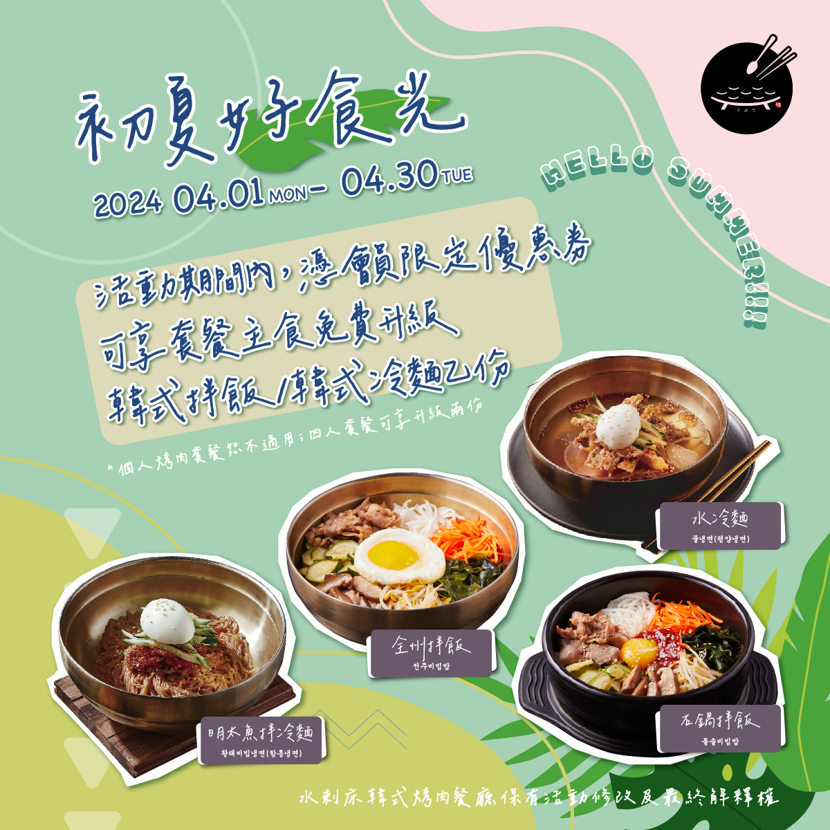 > 會員憑券來店 點選雙人/四人烤肉套餐可享“主食”免費升級韓式冷麵/韓式拌飯