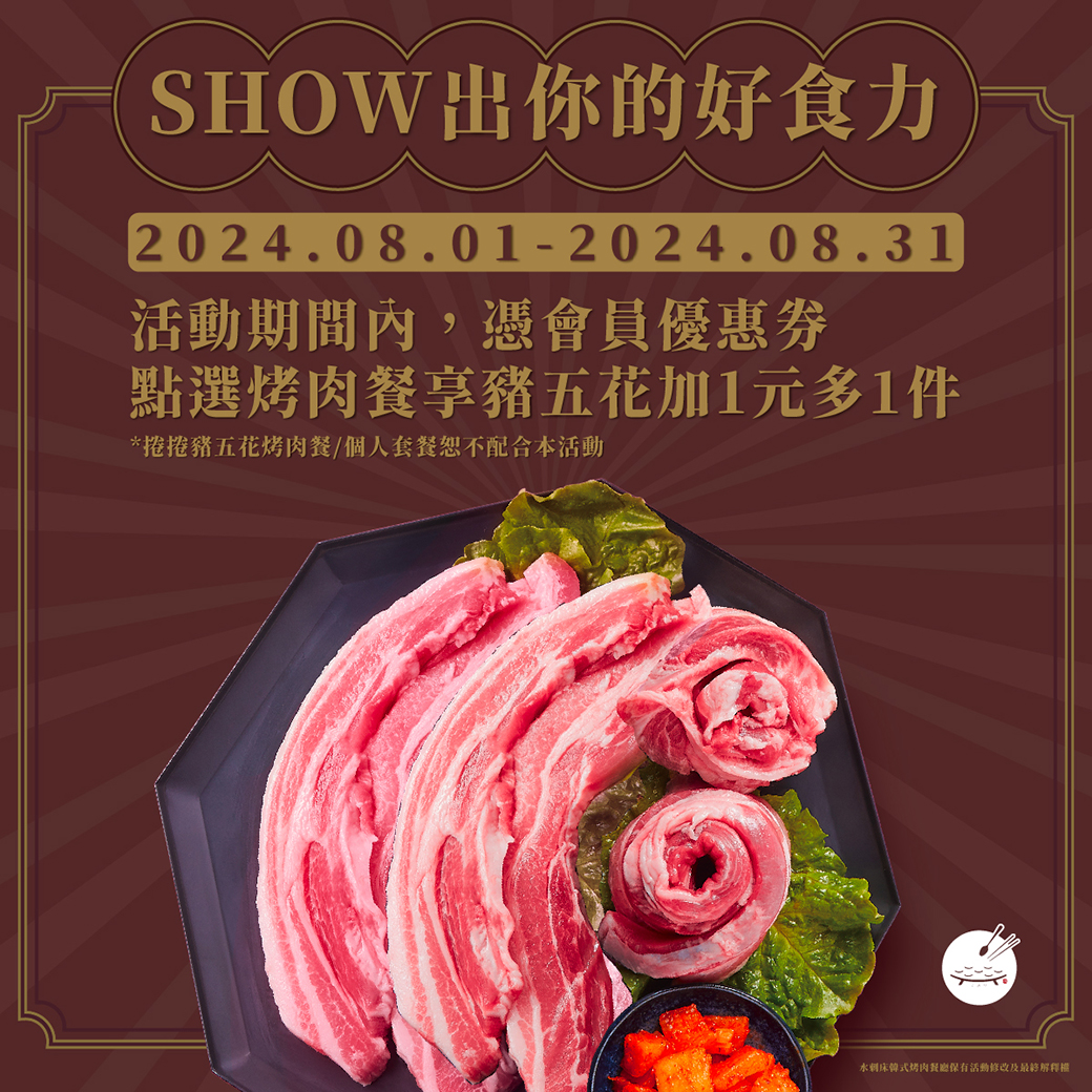 > 會員憑券來店 點選雙人/四人烤肉套餐可享單點豬五花 加1元多1件