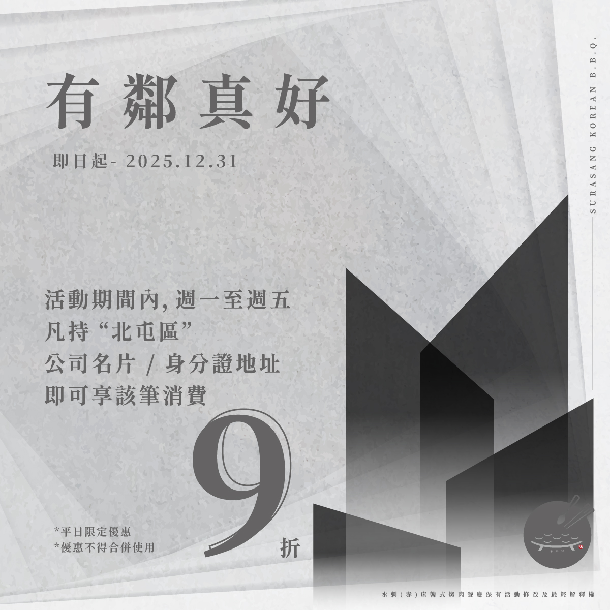 > 週一至週五,週間來店用餐。凡持“北屯區”公司名片 或 身分證地址 即可享該筆消費9折優惠。